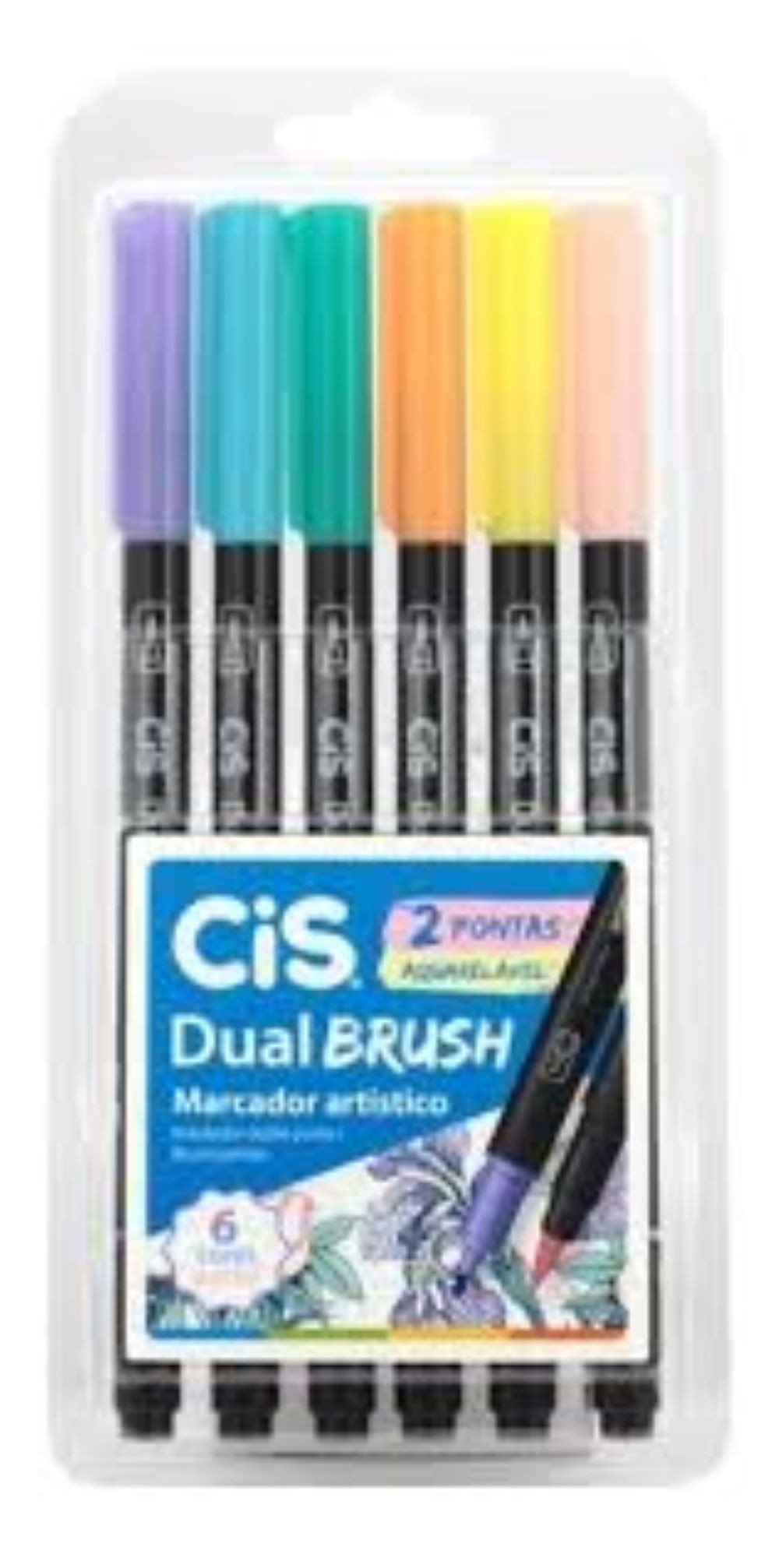 Caneta Cis Dual Brush com 6 cores pasteis com 2 pontas pontas aquarelavel Amarelo Rosa Pessego Verde Azul Lilas