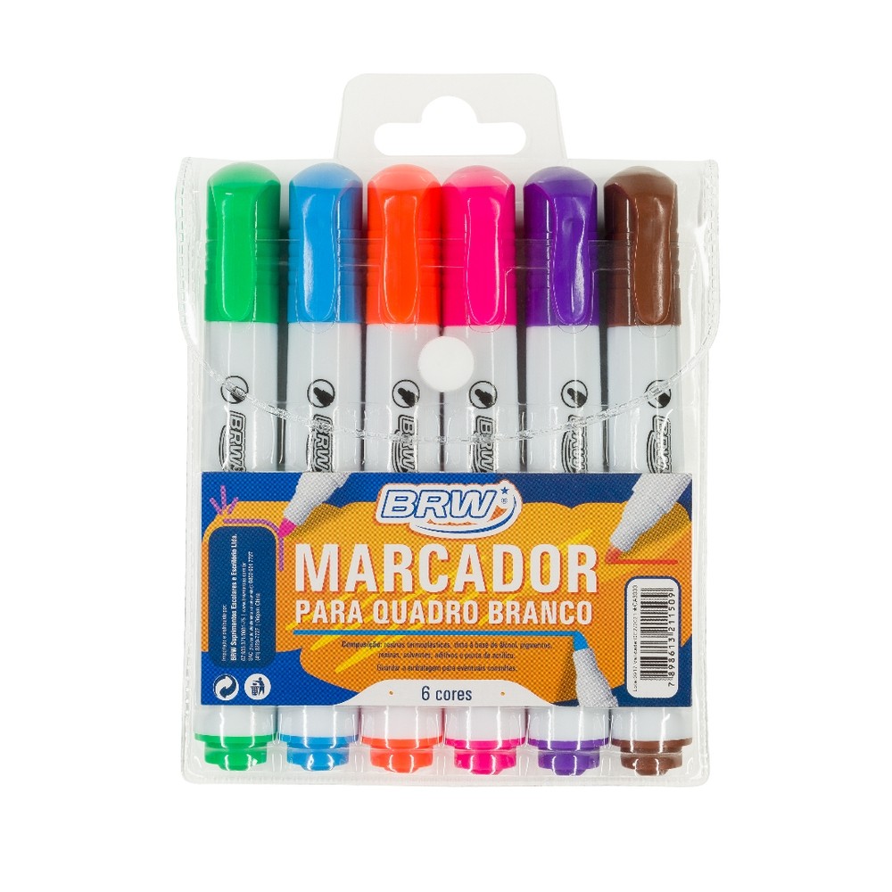 Pincel marcador para quadro branco em esina termplastica , tinta a base de alcool , pigmetnos, resinas, solventes, aditivos e pontas de acrilico com 6 cores: Laranja, Marrom, verde, roxo, rosa, azul